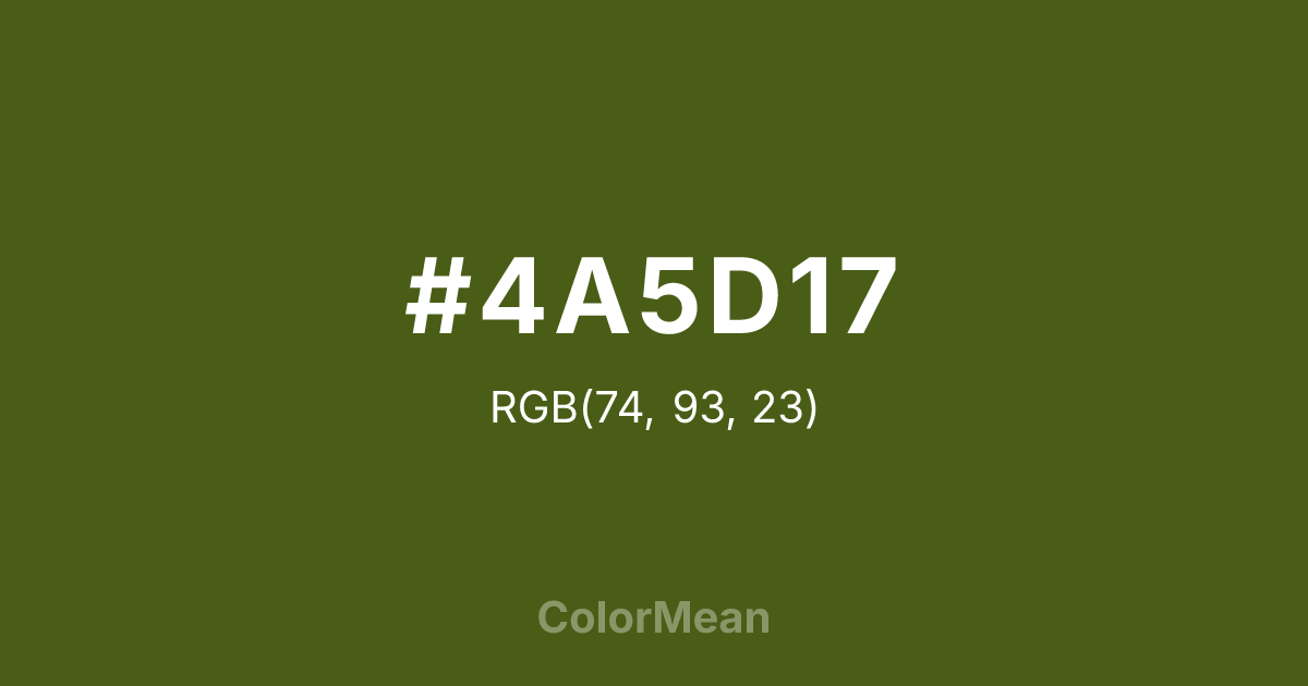 #4A5D17 RGB value is (74, 93, 23). The hex color red value is 74, green is 93, and blue is 23. Its HSL format shows a hue of 76°, saturation of 60 percent, and lightness of 23 percent. The CMYK process values are 20 percent, 0 percent, 75 percent, 64 percent.