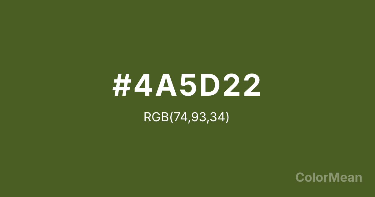 #4A5D22 RGB value is (74, 93, 34). The hex color red value is 74, green is 93, and blue is 34. Its HSL format shows a hue of 79°, saturation of 46 percent, and lightness of 25 percent. The CMYK process values are 20 percent, 0 percent, 63 percent, 64 percent.