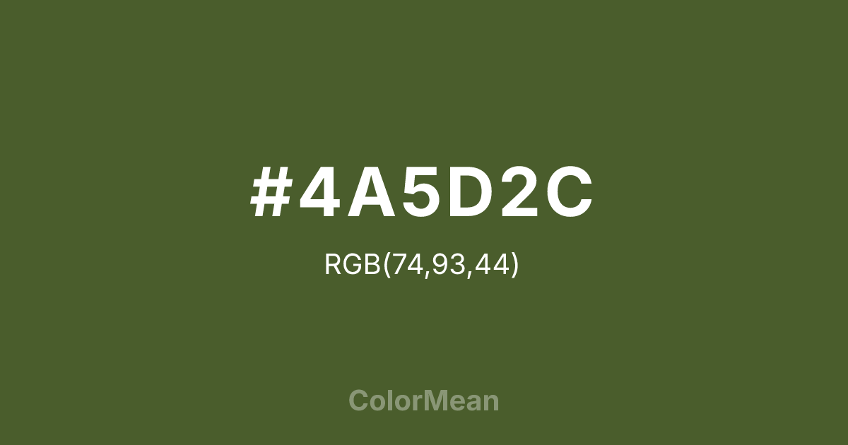 #4A5D2C RGB value is (74, 93, 44). The hex color red value is 74, green is 93, and blue is 44. Its HSL format shows a hue of 83°, saturation of 36 percent, and lightness of 27 percent. The CMYK process values are 20 percent, 0 percent, 53 percent, 64 percent.