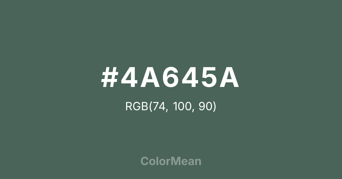 #4A645A RGB value is (74, 100, 90). The hex color red value is 74, green is 100, and blue is 90. Its HSL format shows a hue of 157°, saturation of 15 percent, and lightness of 34 percent. The CMYK process values are 26 percent, 0 percent, 10 percent, 61 percent.