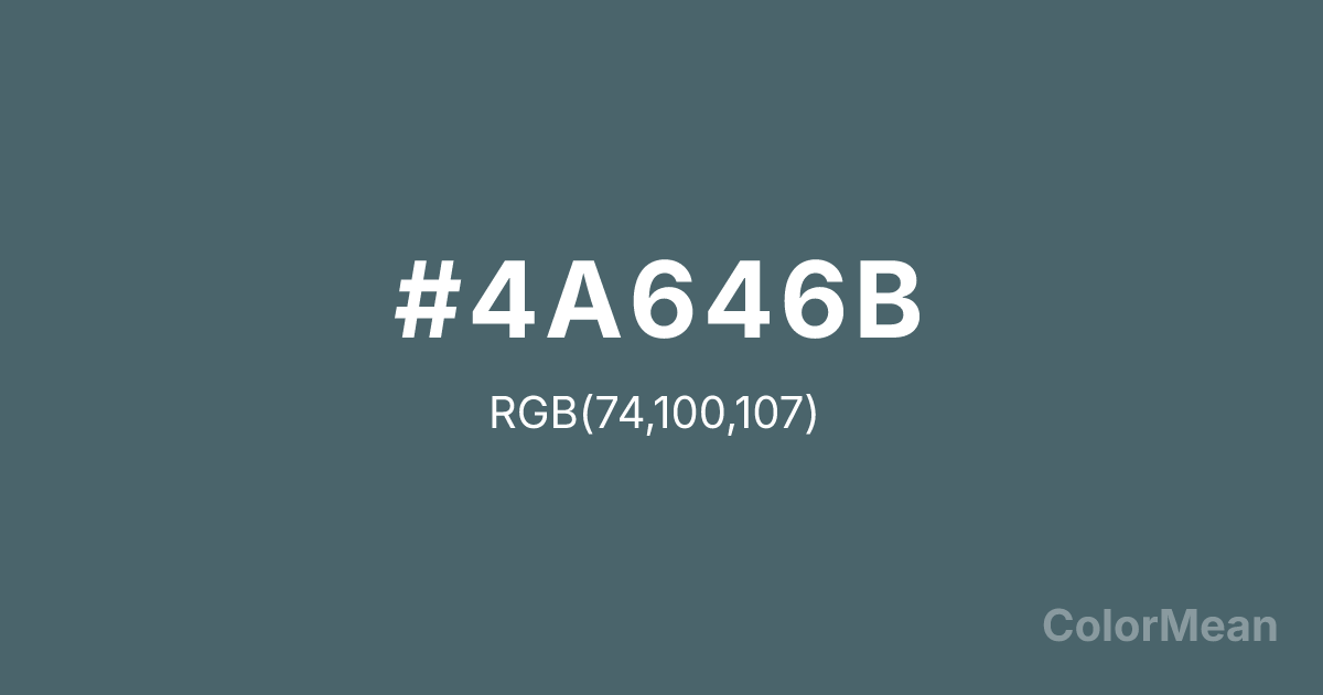 #4A646B RGB value is (74, 100, 107). The hex color red value is 74, green is 100, and blue is 107. Its HSL format shows a hue of 193°, saturation of 18 percent, and lightness of 35 percent. The CMYK process values are 31 percent, 7 percent, 0 percent, 58 percent.