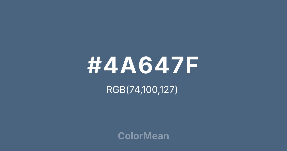 #4A647F RGB value is (74, 100, 127). The hex color red value is 74, green is 100, and blue is 127. Its HSL format shows a hue of 211°, saturation of 26 percent, and lightness of 39 percent. The CMYK process values are 42 percent, 21 percent, 0 percent, 50 percent.