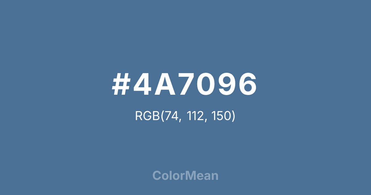 #4A7096 RGB value is (74, 112, 150). The hex color red value is 74, green is 112, and blue is 150. Its HSL format shows a hue of 210°, saturation of 34 percent, and lightness of 44 percent. The CMYK process values are 51 percent, 25 percent, 0 percent, 41 percent.