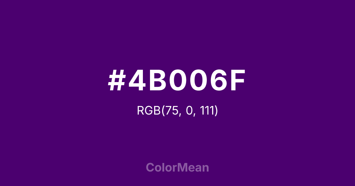 #4B006F RGB value is (75, 0, 111). The hex color red value is 75, green is 0, and blue is 111. Its HSL format shows a hue of 281°, saturation of 100 percent, and lightness of 22 percent. The CMYK process values are 32 percent, 100 percent, 0 percent, 56 percent.