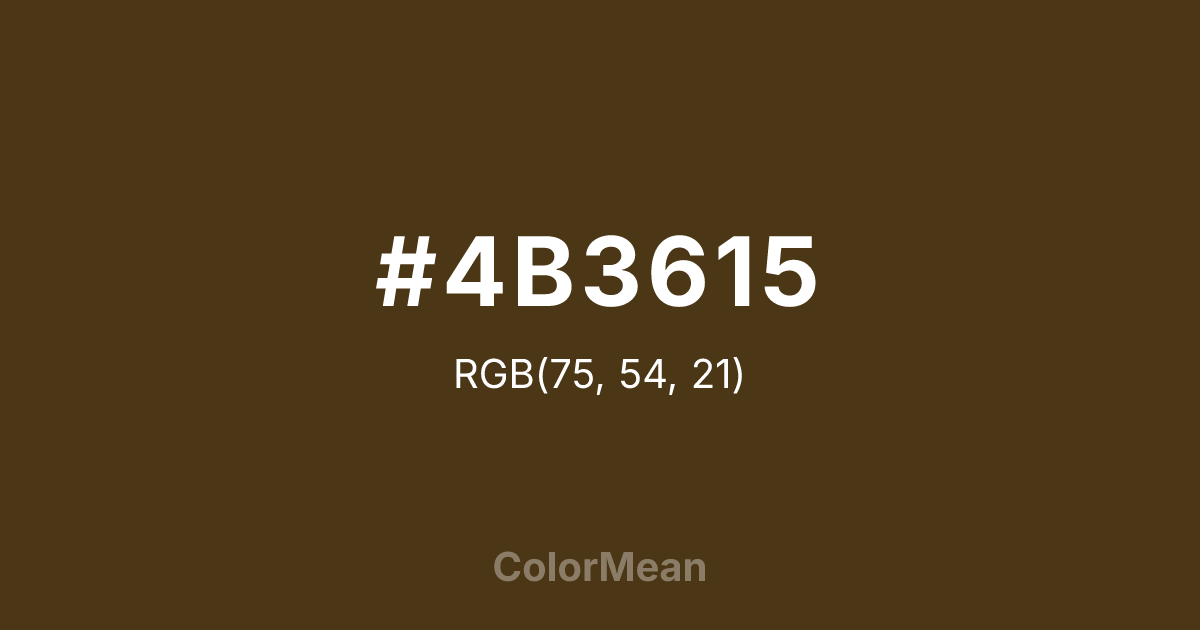 #4B3615 RGB value is (75, 54, 21). The hex color red value is 75, green is 54, and blue is 21. Its HSL format shows a hue of 37°, saturation of 56 percent, and lightness of 19 percent. The CMYK process values are 0 percent, 28 percent, 72 percent, 71 percent.