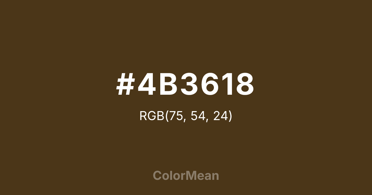 #4B3618 RGB value is (75, 54, 24). The hex color red value is 75, green is 54, and blue is 24. Its HSL format shows a hue of 35°, saturation of 52 percent, and lightness of 19 percent. The CMYK process values are 0 percent, 28 percent, 68 percent, 71 percent.