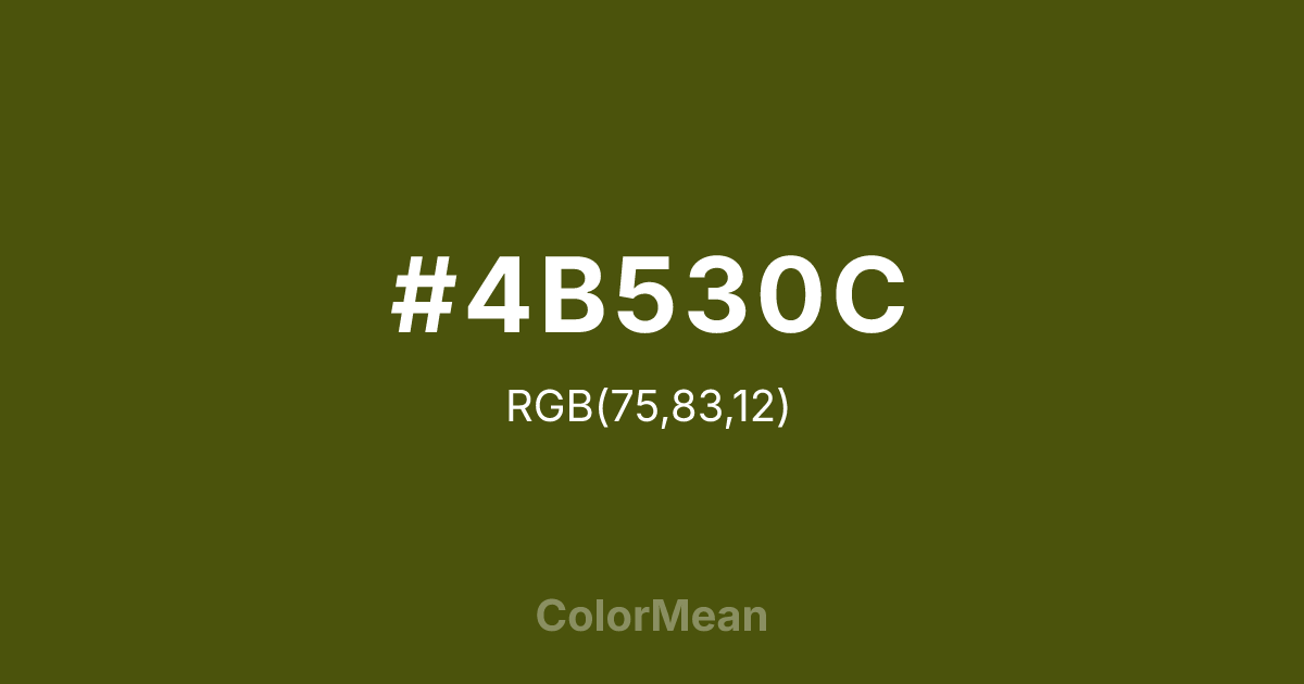 #4B530C RGB value is (75, 83, 12). The hex color red value is 75, green is 83, and blue is 12. Its HSL format shows a hue of 67°, saturation of 75 percent, and lightness of 19 percent. The CMYK process values are 10 percent, 0 percent, 86 percent, 67 percent.