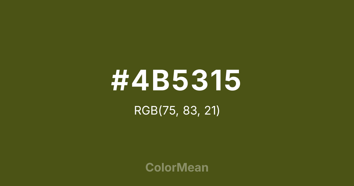 #4B5315 RGB value is (75, 83, 21). The hex color red value is 75, green is 83, and blue is 21. Its HSL format shows a hue of 68°, saturation of 60 percent, and lightness of 20 percent. The CMYK process values are 10 percent, 0 percent, 75 percent, 67 percent.