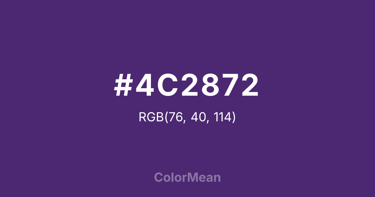 #4C2872 RGB value is (76, 40, 114). The hex color red value is 76, green is 40, and blue is 114. Its HSL format shows a hue of 269°, saturation of 48 percent, and lightness of 30 percent. The CMYK process values are 33 percent, 65 percent, 0 percent, 55 percent.