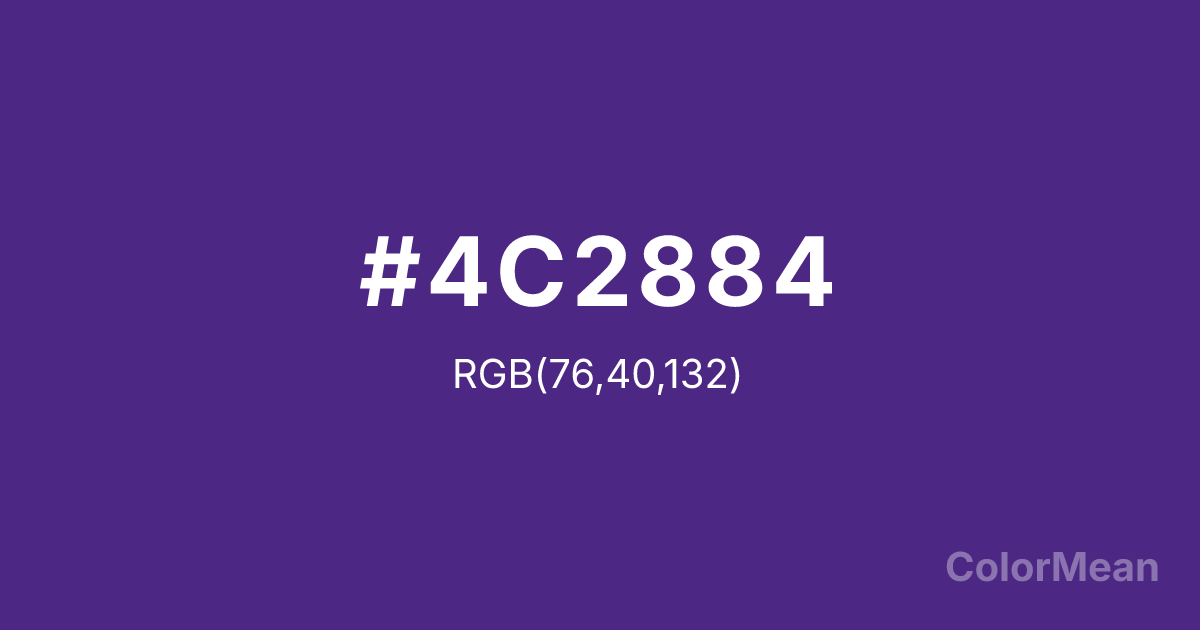 #4C2884 RGB value is (76, 40, 132). The hex color red value is 76, green is 40, and blue is 132. Its HSL format shows a hue of 263°, saturation of 53 percent, and lightness of 34 percent. The CMYK process values are 42 percent, 70 percent, 0 percent, 48 percent.