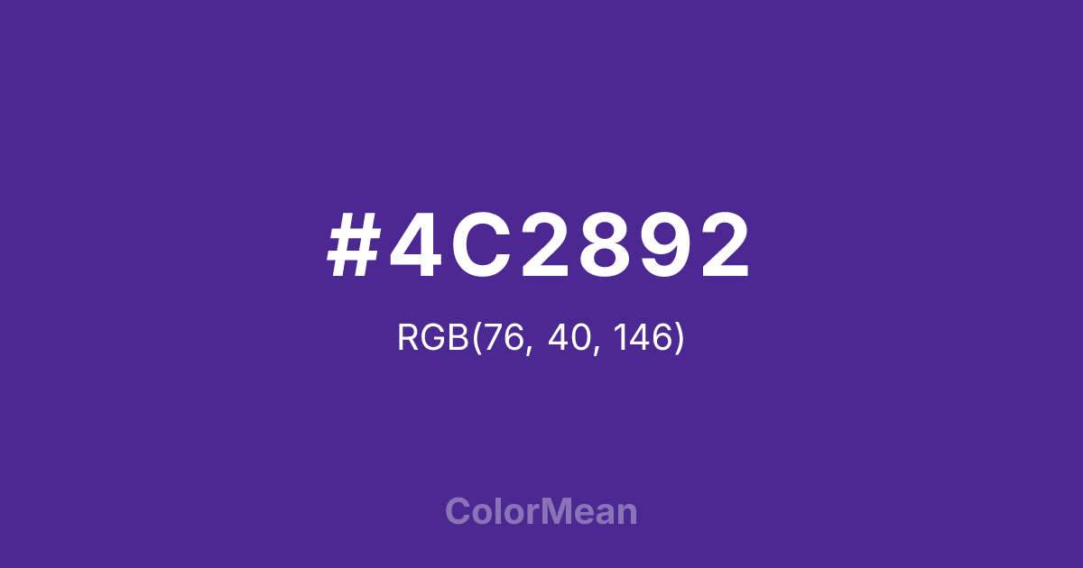 #4C2892 RGB value is (76, 40, 146). The hex color red value is 76, green is 40, and blue is 146. Its HSL format shows a hue of 260°, saturation of 57 percent, and lightness of 36 percent. The CMYK process values are 48 percent, 73 percent, 0 percent, 43 percent.