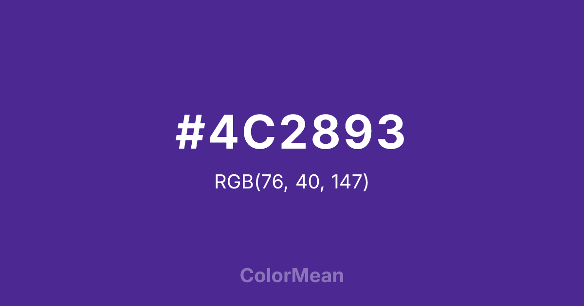 #4C2893 RGB value is (76, 40, 147). The hex color red value is 76, green is 40, and blue is 147. Its HSL format shows a hue of 260°, saturation of 57 percent, and lightness of 37 percent. The CMYK process values are 48 percent, 73 percent, 0 percent, 42 percent.