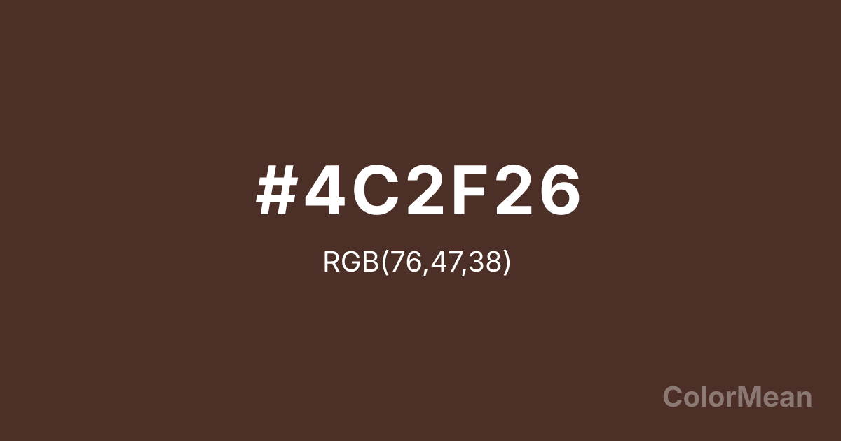 #4C2F26 RGB value is (76, 47, 38). The hex color red value is 76, green is 47, and blue is 38. Its HSL format shows a hue of 14°, saturation of 33 percent, and lightness of 22 percent. The CMYK process values are 0 percent, 38 percent, 50 percent, 70 percent.