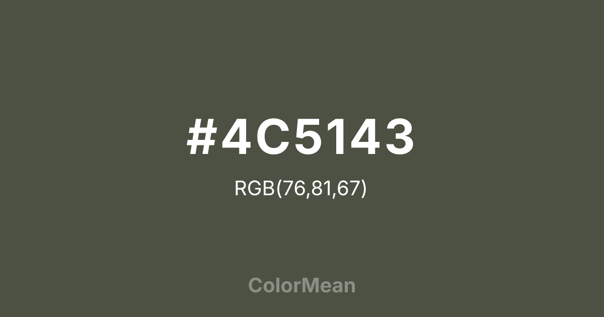 #4C5143 RGB value is (76, 81, 67). The hex color red value is 76, green is 81, and blue is 67. Its HSL format shows a hue of 81°, saturation of 9 percent, and lightness of 29 percent. The CMYK process values are 6 percent, 0 percent, 17 percent, 68 percent.