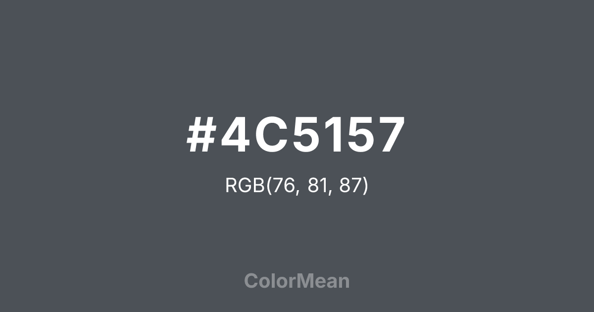 #4C5157 RGB value is (76, 81, 87). The hex color red value is 76, green is 81, and blue is 87. Its HSL format shows a hue of 213°, saturation of 7 percent, and lightness of 32 percent. The CMYK process values are 13 percent, 7 percent, 0 percent, 66 percent.