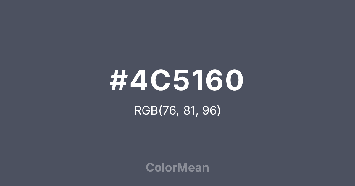 #4C5160 RGB value is (76, 81, 96). The hex color red value is 76, green is 81, and blue is 96. Its HSL format shows a hue of 225°, saturation of 12 percent, and lightness of 34 percent. The CMYK process values are 21 percent, 16 percent, 0 percent, 62 percent.