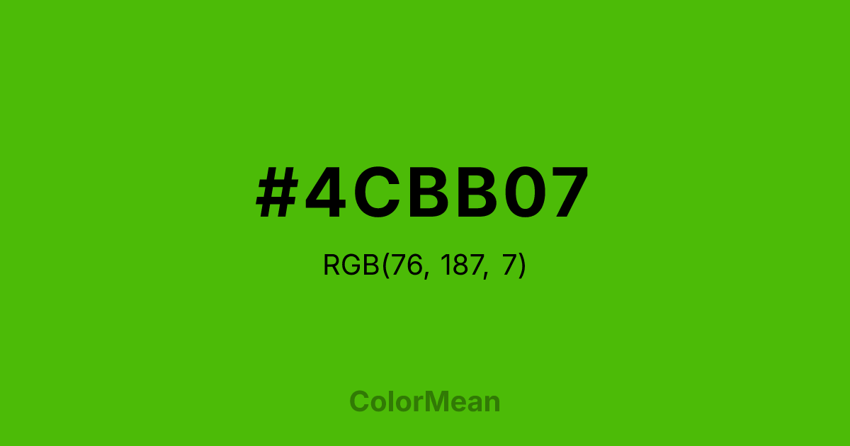 #4CBB07 RGB value is (76, 187, 7). The hex color red value is 76, green is 187, and blue is 7. Its HSL format shows a hue of 97°, saturation of 93 percent, and lightness of 38 percent. The CMYK process values are 59 percent, 0 percent, 96 percent, 27 percent.