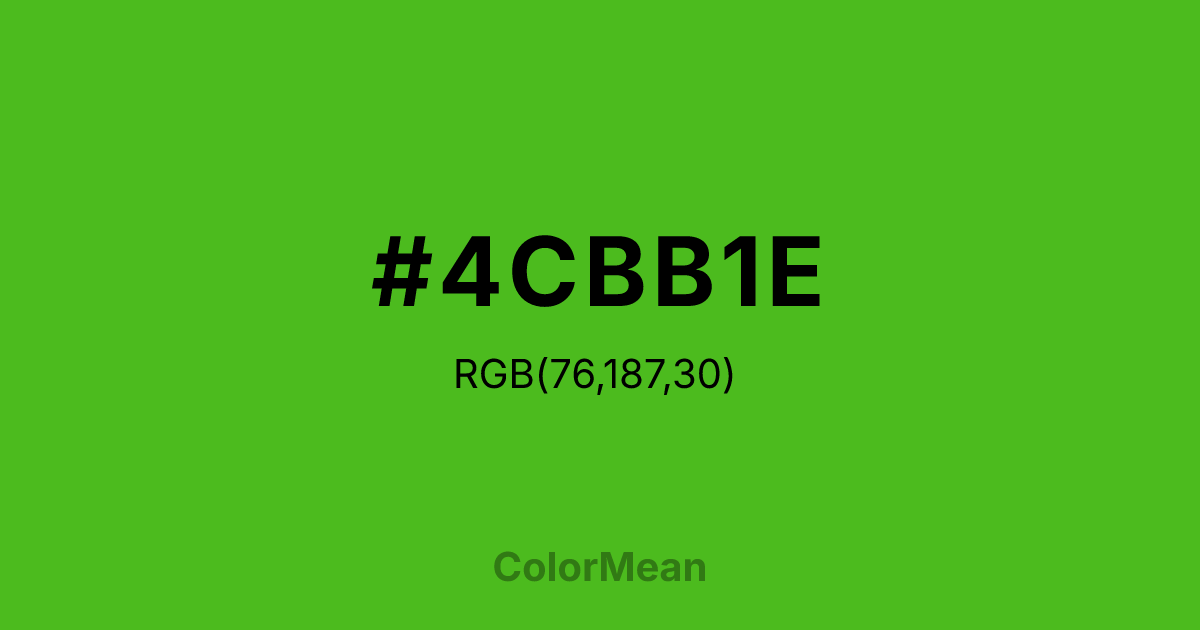 #4CBB1E RGB value is (76, 187, 30). The hex color red value is 76, green is 187, and blue is 30. Its HSL format shows a hue of 102°, saturation of 72 percent, and lightness of 43 percent. The CMYK process values are 59 percent, 0 percent, 84 percent, 27 percent.