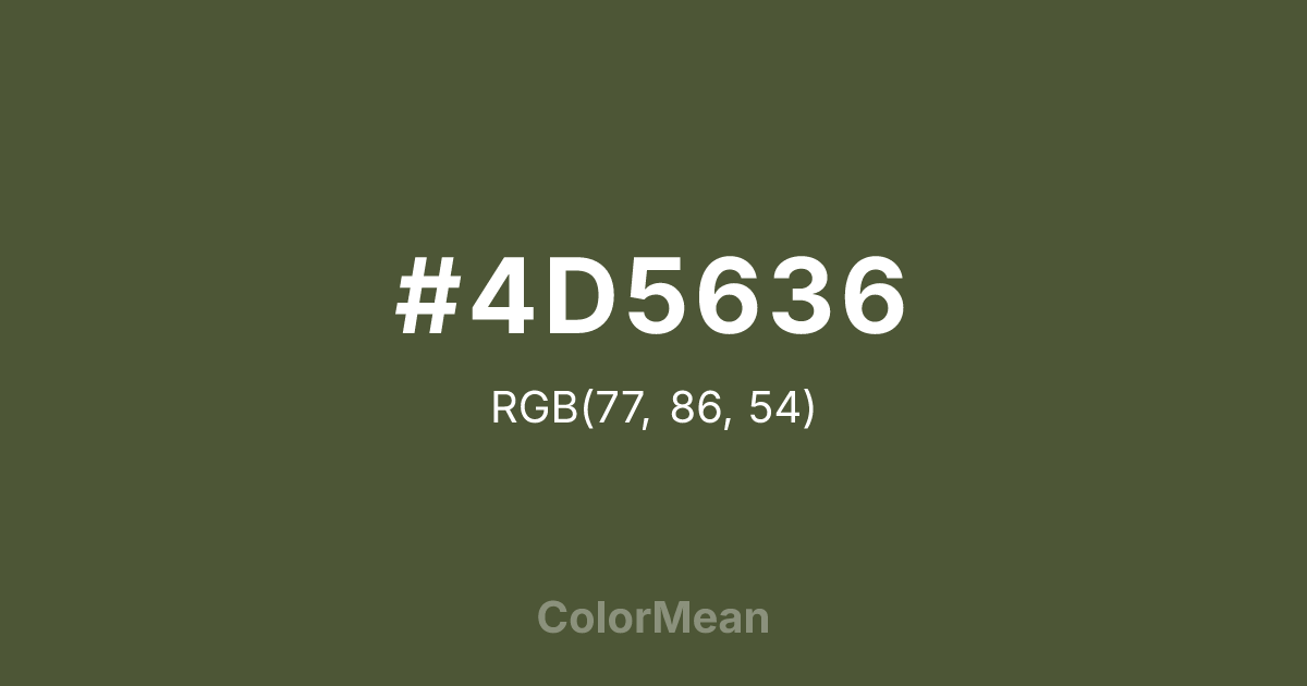#4D5636 RGB value is (77, 86, 54). The hex color red value is 77, green is 86, and blue is 54. Its HSL format shows a hue of 77°, saturation of 23 percent, and lightness of 27 percent. The CMYK process values are 10 percent, 0 percent, 37 percent, 66 percent.