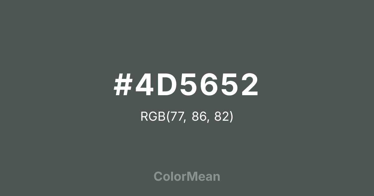 #4D5652 RGB value is (77, 86, 82). The hex color red value is 77, green is 86, and blue is 82. Its HSL format shows a hue of 153°, saturation of 6 percent, and lightness of 32 percent. The CMYK process values are 10 percent, 0 percent, 5 percent, 66 percent.