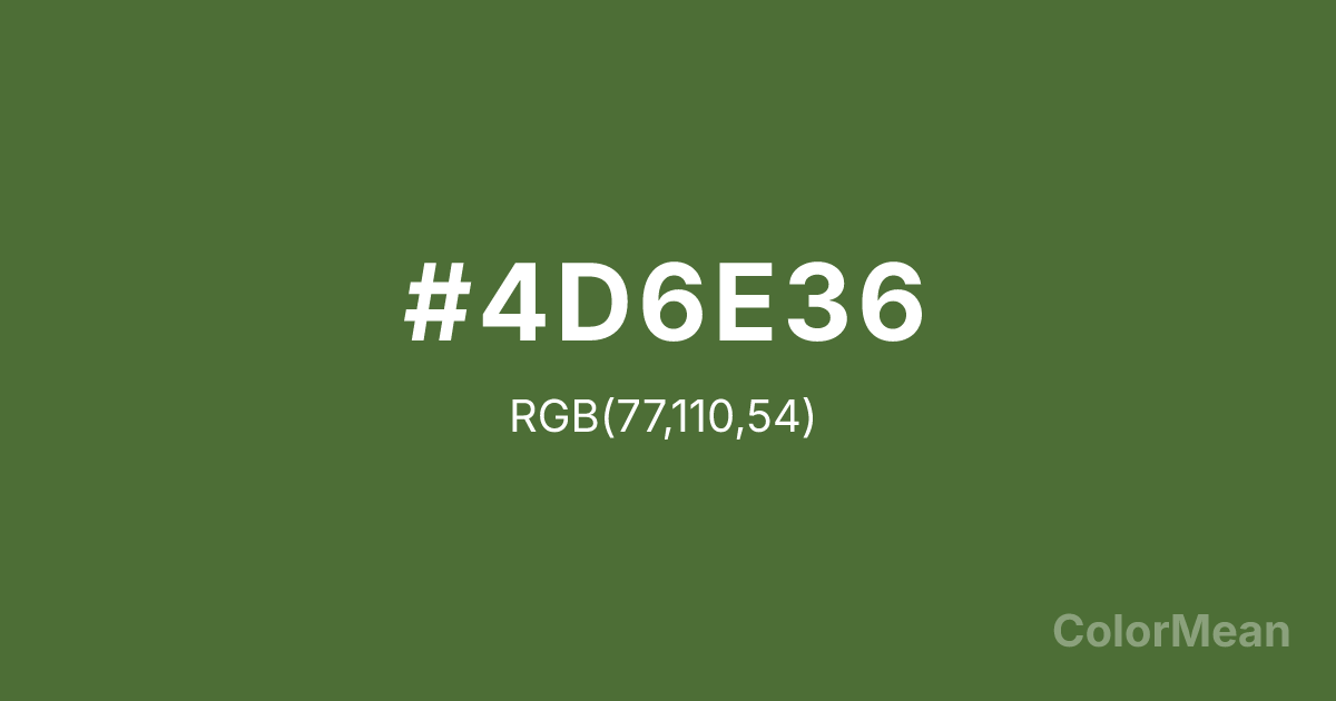 #4D6E36 RGB value is (77, 110, 54). The hex color red value is 77, green is 110, and blue is 54. Its HSL format shows a hue of 95°, saturation of 34 percent, and lightness of 32 percent. The CMYK process values are 30 percent, 0 percent, 51 percent, 57 percent.