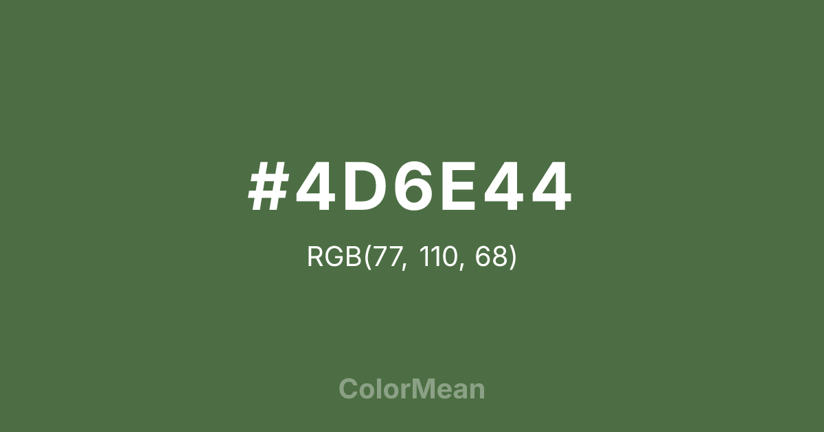 #4D6E44 RGB value is (77, 110, 68). The hex color red value is 77, green is 110, and blue is 68. Its HSL format shows a hue of 107°, saturation of 24 percent, and lightness of 35 percent. The CMYK process values are 30 percent, 0 percent, 38 percent, 57 percent.
