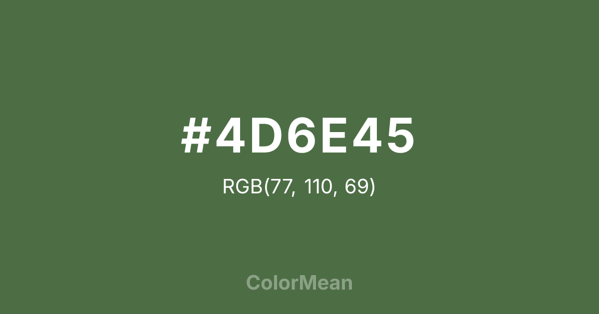#4D6E45 RGB value is (77, 110, 69). The hex color red value is 77, green is 110, and blue is 69. Its HSL format shows a hue of 108°, saturation of 23 percent, and lightness of 35 percent. The CMYK process values are 30 percent, 0 percent, 37 percent, 57 percent.