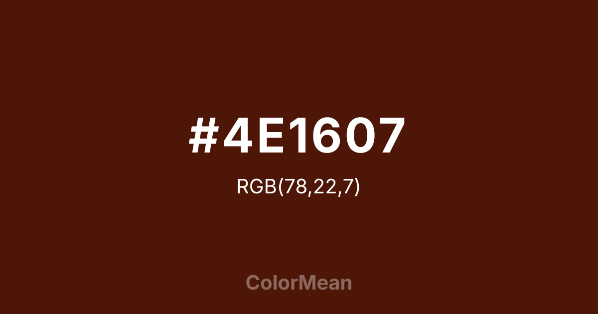 #4E1607 RGB value is (78, 22, 7). The hex color red value is 78, green is 22, and blue is 7. Its HSL format shows a hue of 13°, saturation of 84 percent, and lightness of 17 percent. The CMYK process values are 0 percent, 72 percent, 91 percent, 69 percent.