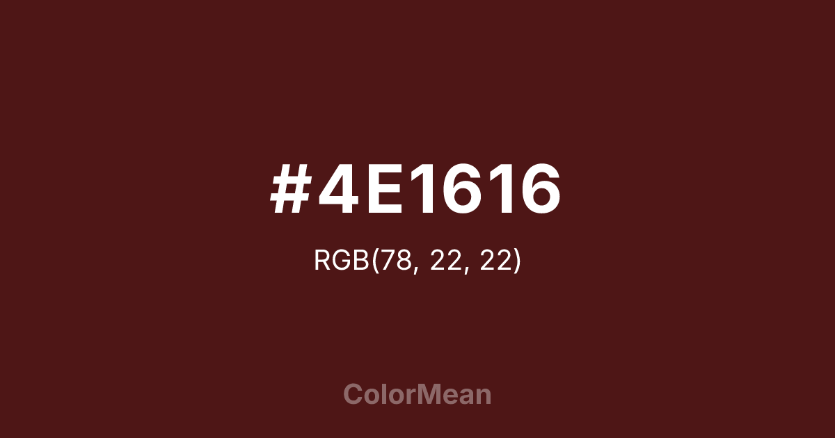 #4E1616 RGB value is (78, 22, 22). The hex color red value is 78, green is 22, and blue is 22. Its HSL format shows a hue of 0°, saturation of 56 percent, and lightness of 20 percent. The CMYK process values are 0 percent, 72 percent, 72 percent, 69 percent.