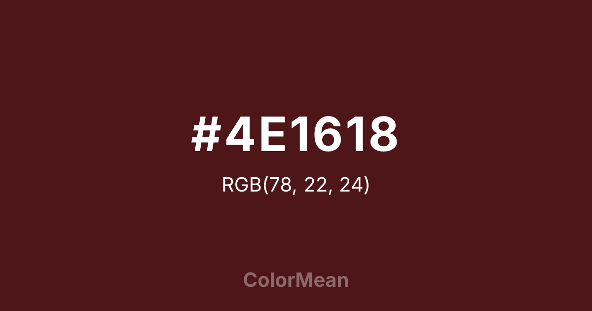 #4E1618 RGB value is (78, 22, 24). The hex color red value is 78, green is 22, and blue is 24. Its HSL format shows a hue of 358°, saturation of 56 percent, and lightness of 20 percent. The CMYK process values are 0 percent, 72 percent, 69 percent, 69 percent.