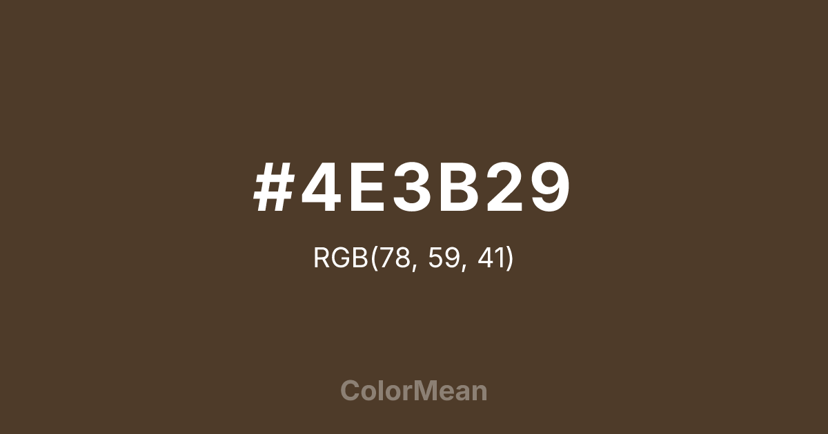 #4E3B29 RGB value is (78, 59, 41). The hex color red value is 78, green is 59, and blue is 41. Its HSL format shows a hue of 29°, saturation of 31 percent, and lightness of 23 percent. The CMYK process values are 0 percent, 24 percent, 47 percent, 69 percent.