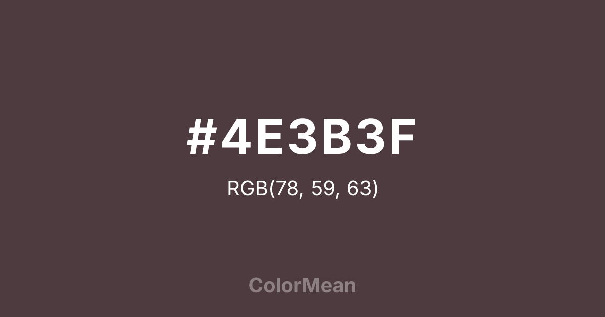 #4E3B3F RGB value is (78, 59, 63). The hex color red value is 78, green is 59, and blue is 63. Its HSL format shows a hue of 347°, saturation of 14 percent, and lightness of 27 percent. The CMYK process values are 0 percent, 24 percent, 19 percent, 69 percent.