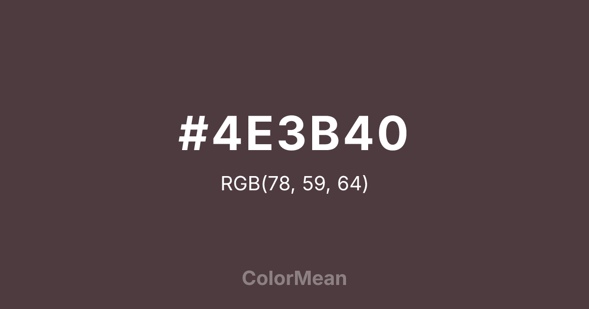#4E3B40 RGB value is (78, 59, 64). The hex color red value is 78, green is 59, and blue is 64. Its HSL format shows a hue of 344°, saturation of 14 percent, and lightness of 27 percent. The CMYK process values are 0 percent, 24 percent, 18 percent, 69 percent.