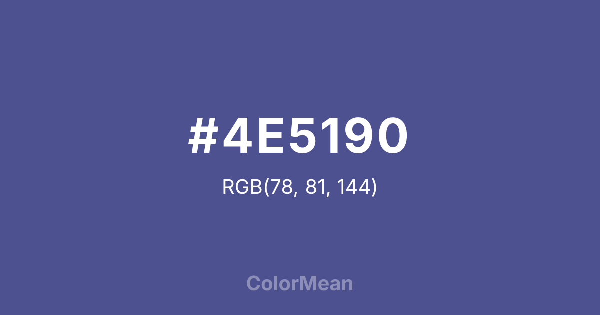 #4E5190 RGB value is (78, 81, 144). The hex color red value is 78, green is 81, and blue is 144. Its HSL format shows a hue of 237°, saturation of 30 percent, and lightness of 44 percent. The CMYK process values are 46 percent, 44 percent, 0 percent, 44 percent.