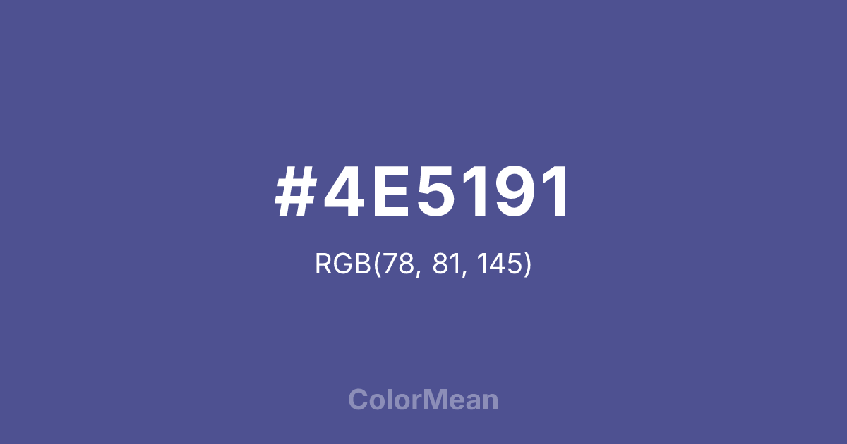 #4E5191 RGB value is (78, 81, 145). The hex color red value is 78, green is 81, and blue is 145. Its HSL format shows a hue of 237°, saturation of 30 percent, and lightness of 44 percent. The CMYK process values are 46 percent, 44 percent, 0 percent, 43 percent.