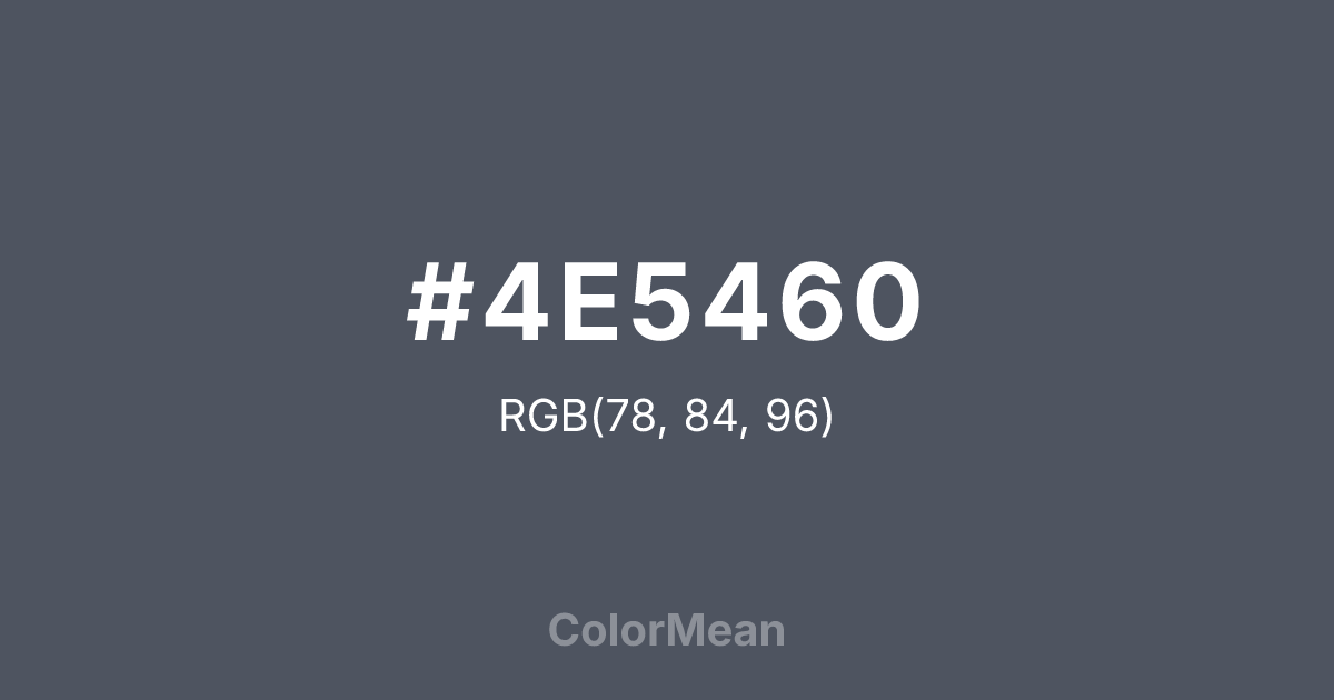 #4E5460 RGB value is (78, 84, 96). The hex color red value is 78, green is 84, and blue is 96. Its HSL format shows a hue of 220°, saturation of 10 percent, and lightness of 34 percent. The CMYK process values are 19 percent, 13 percent, 0 percent, 62 percent.