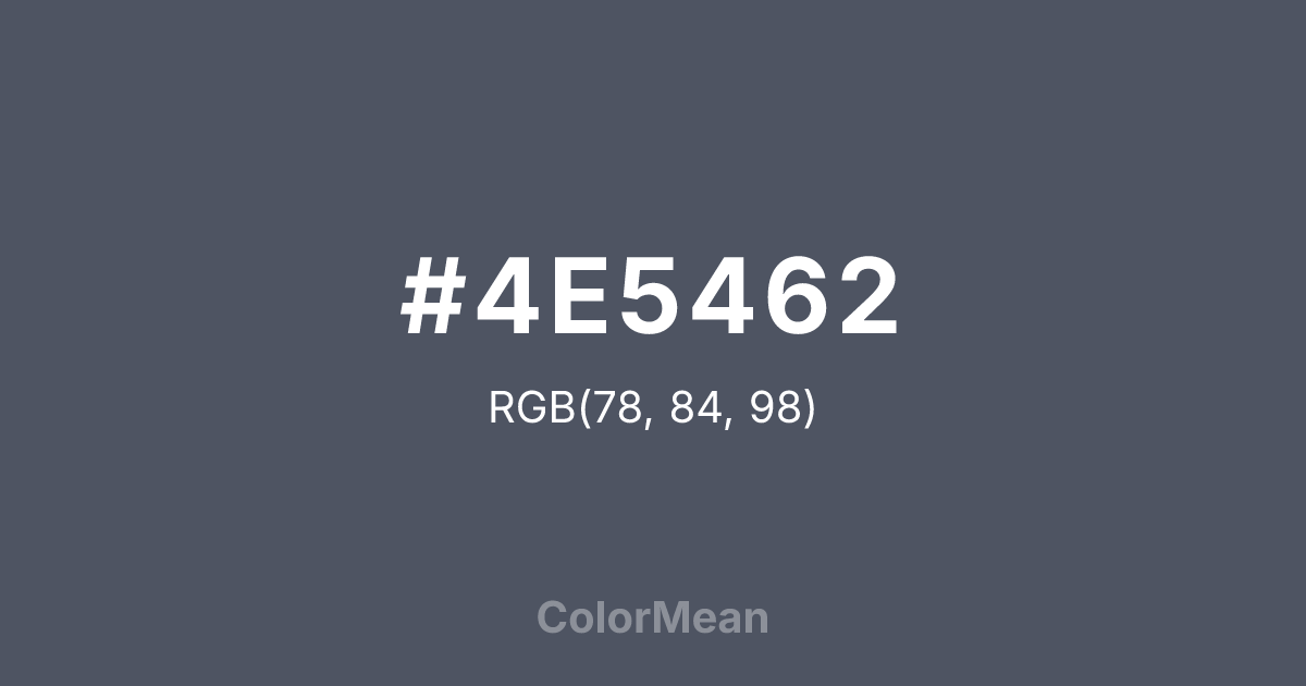 #4E5462 RGB value is (78, 84, 98). The hex color red value is 78, green is 84, and blue is 98. Its HSL format shows a hue of 222°, saturation of 11 percent, and lightness of 35 percent. The CMYK process values are 20 percent, 14 percent, 0 percent, 62 percent.