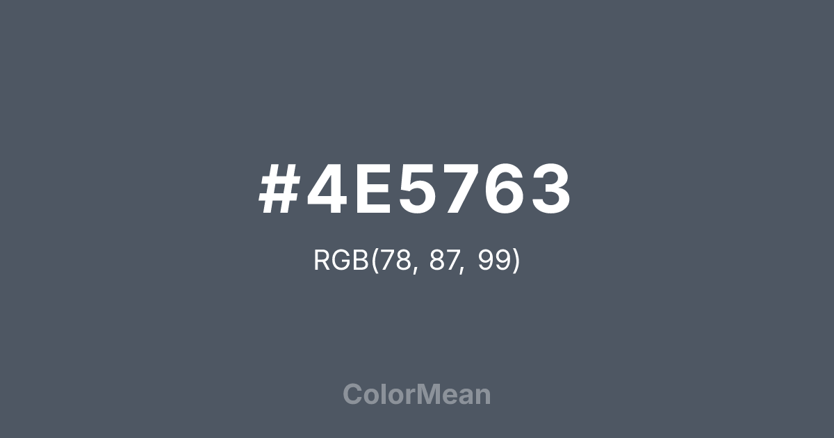 #4E5763 RGB value is (78, 87, 99). The hex color red value is 78, green is 87, and blue is 99. Its HSL format shows a hue of 214°, saturation of 12 percent, and lightness of 35 percent. The CMYK process values are 21 percent, 12 percent, 0 percent, 61 percent.