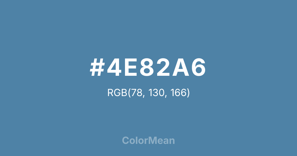 #4E82A6 RGB value is (78, 130, 166). The hex color red value is 78, green is 130, and blue is 166. Its HSL format shows a hue of 205°, saturation of 36 percent, and lightness of 48 percent. The CMYK process values are 53 percent, 22 percent, 0 percent, 35 percent.