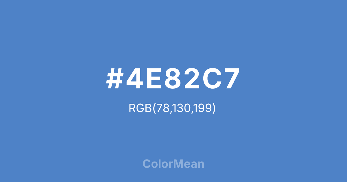 #4E82C7 RGB value is (78, 130, 199). The hex color red value is 78, green is 130, and blue is 199. Its HSL format shows a hue of 214°, saturation of 52 percent, and lightness of 54 percent. The CMYK process values are 61 percent, 35 percent, 0 percent, 22 percent.