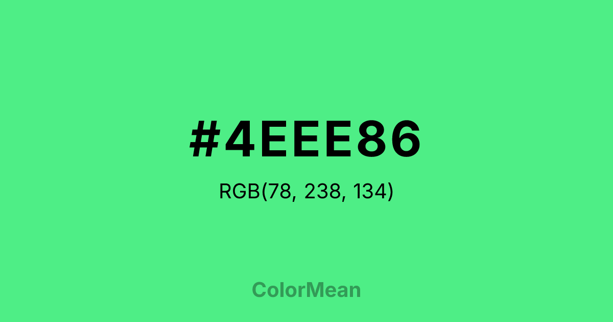 #4EEE86 RGB value is (78, 238, 134). The hex color red value is 78, green is 238, and blue is 134. Its HSL format shows a hue of 141°, saturation of 82 percent, and lightness of 62 percent. The CMYK process values are 67 percent, 0 percent, 44 percent, 7 percent.