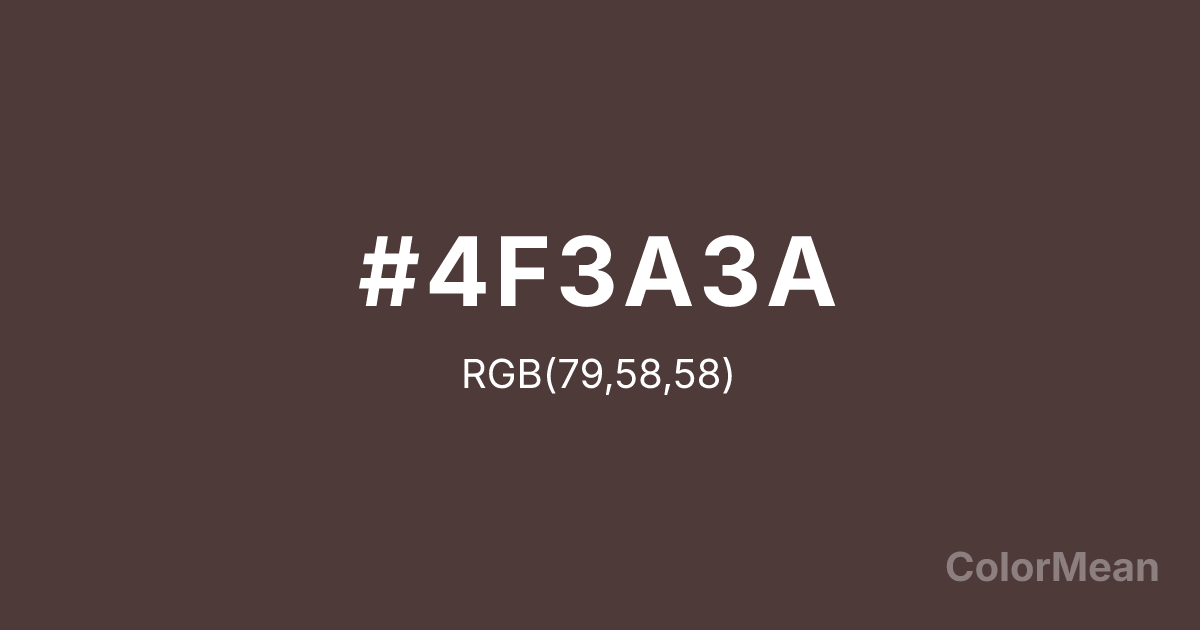 #4F3A3A RGB value is (79, 58, 58). The hex color red value is 79, green is 58, and blue is 58. Its HSL format shows a hue of 0°, saturation of 15 percent, and lightness of 27 percent. The CMYK process values are 0 percent, 27 percent, 27 percent, 69 percent.