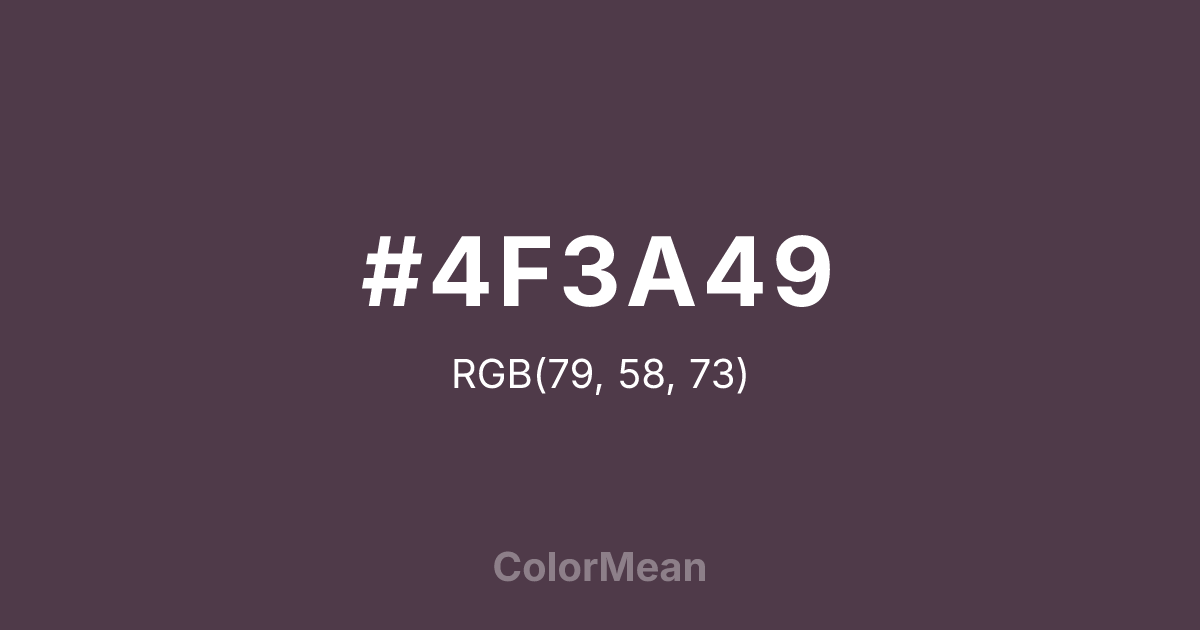 #4F3A49 RGB value is (79, 58, 73). The hex color red value is 79, green is 58, and blue is 73. Its HSL format shows a hue of 317°, saturation of 15 percent, and lightness of 27 percent. The CMYK process values are 0 percent, 27 percent, 8 percent, 69 percent.