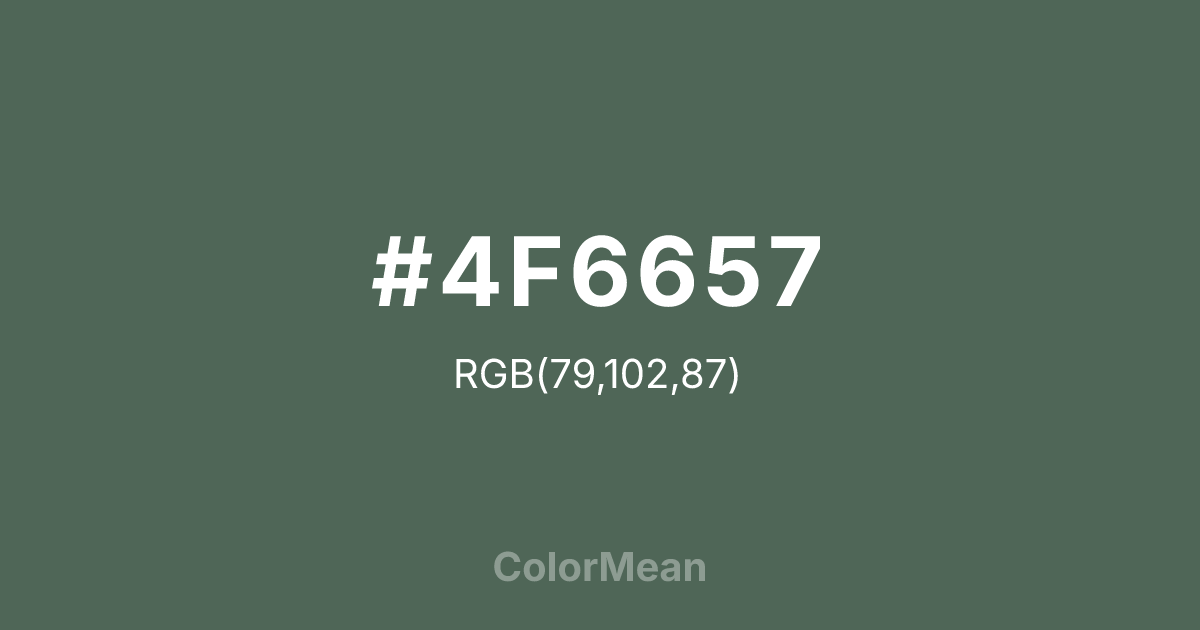 #4F6657 RGB value is (79, 102, 87). The hex color red value is 79, green is 102, and blue is 87. Its HSL format shows a hue of 141°, saturation of 13 percent, and lightness of 35 percent. The CMYK process values are 23 percent, 0 percent, 15 percent, 60 percent.
