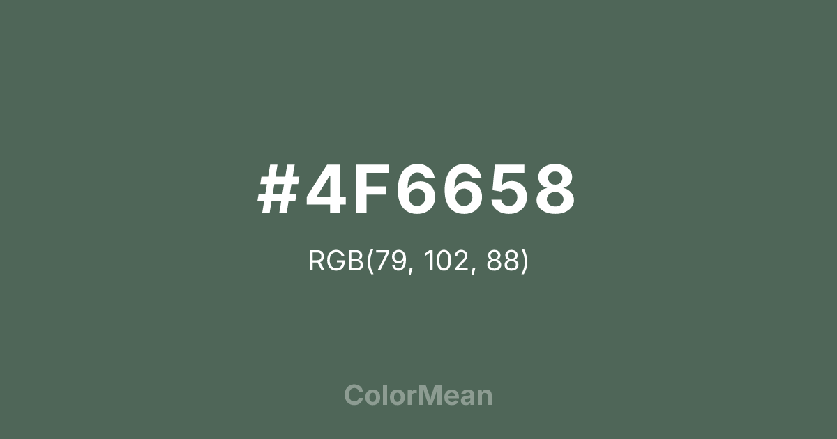 #4F6658 RGB value is (79, 102, 88). The hex color red value is 79, green is 102, and blue is 88. Its HSL format shows a hue of 143°, saturation of 13 percent, and lightness of 35 percent. The CMYK process values are 23 percent, 0 percent, 14 percent, 60 percent.