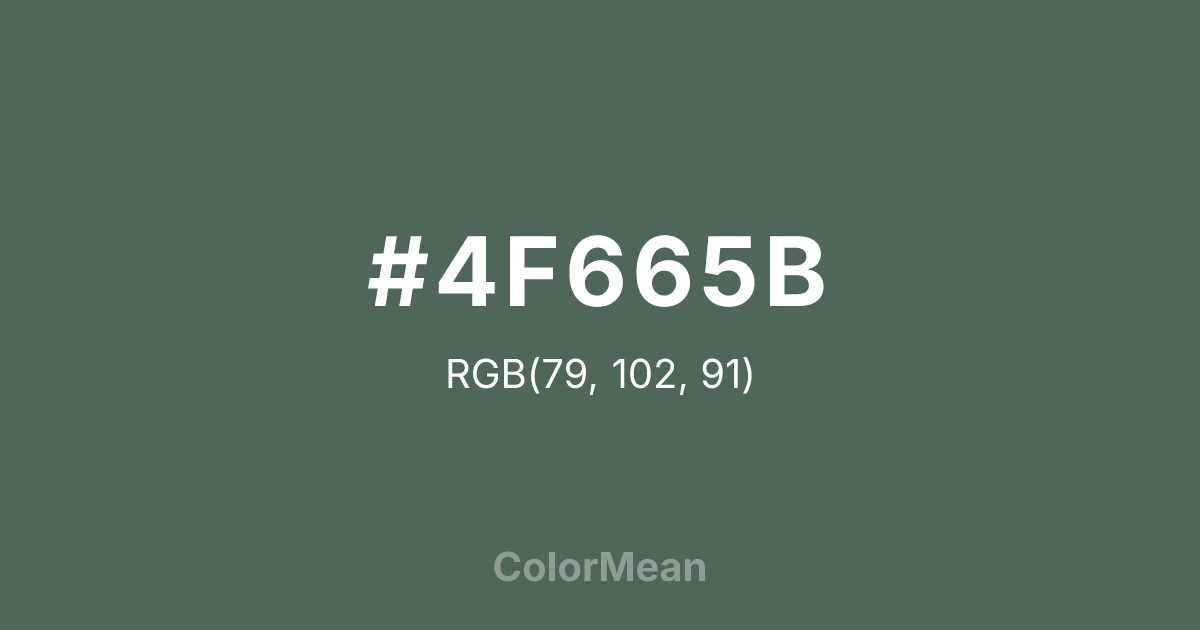 #4F665B RGB value is (79, 102, 91). The hex color red value is 79, green is 102, and blue is 91. Its HSL format shows a hue of 151°, saturation of 13 percent, and lightness of 35 percent. The CMYK process values are 23 percent, 0 percent, 11 percent, 60 percent.
