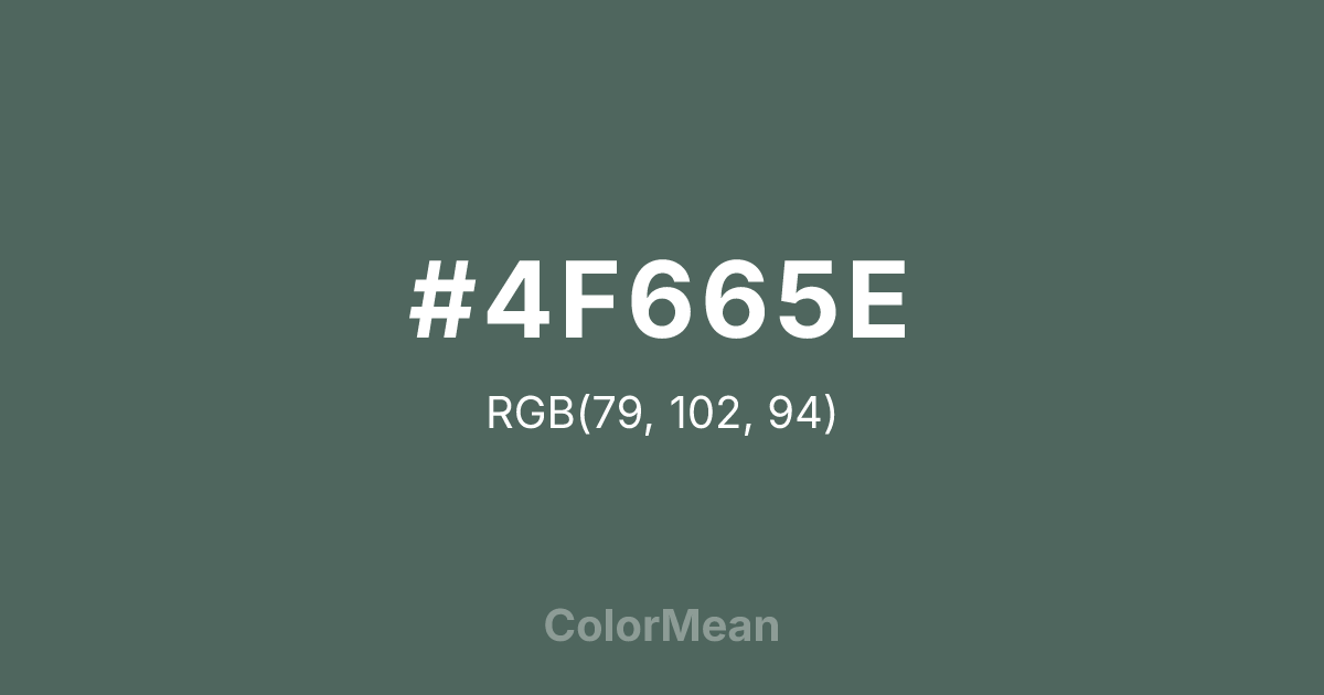 #4F665E RGB value is (79, 102, 94). The hex color red value is 79, green is 102, and blue is 94. Its HSL format shows a hue of 159°, saturation of 13 percent, and lightness of 35 percent. The CMYK process values are 23 percent, 0 percent, 8 percent, 60 percent.