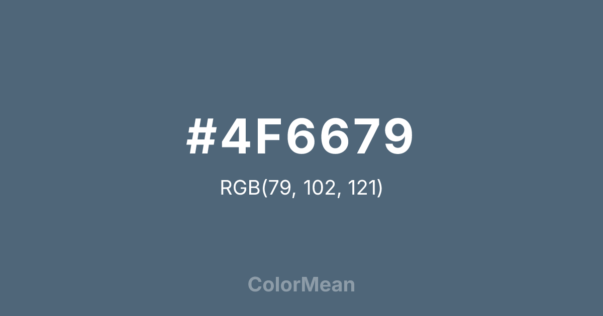 #4F6679 RGB value is (79, 102, 121). The hex color red value is 79, green is 102, and blue is 121. Its HSL format shows a hue of 207°, saturation of 21 percent, and lightness of 39 percent. The CMYK process values are 35 percent, 16 percent, 0 percent, 53 percent.