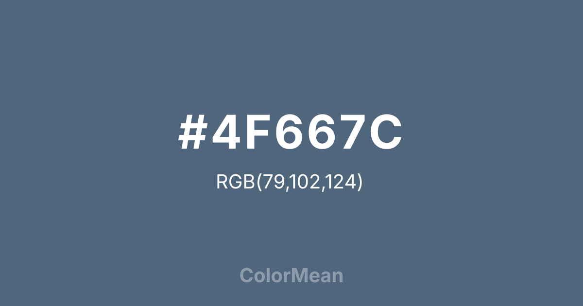 #4F667C RGB value is (79, 102, 124). The hex color red value is 79, green is 102, and blue is 124. Its HSL format shows a hue of 209°, saturation of 22 percent, and lightness of 40 percent. The CMYK process values are 36 percent, 18 percent, 0 percent, 51 percent.
