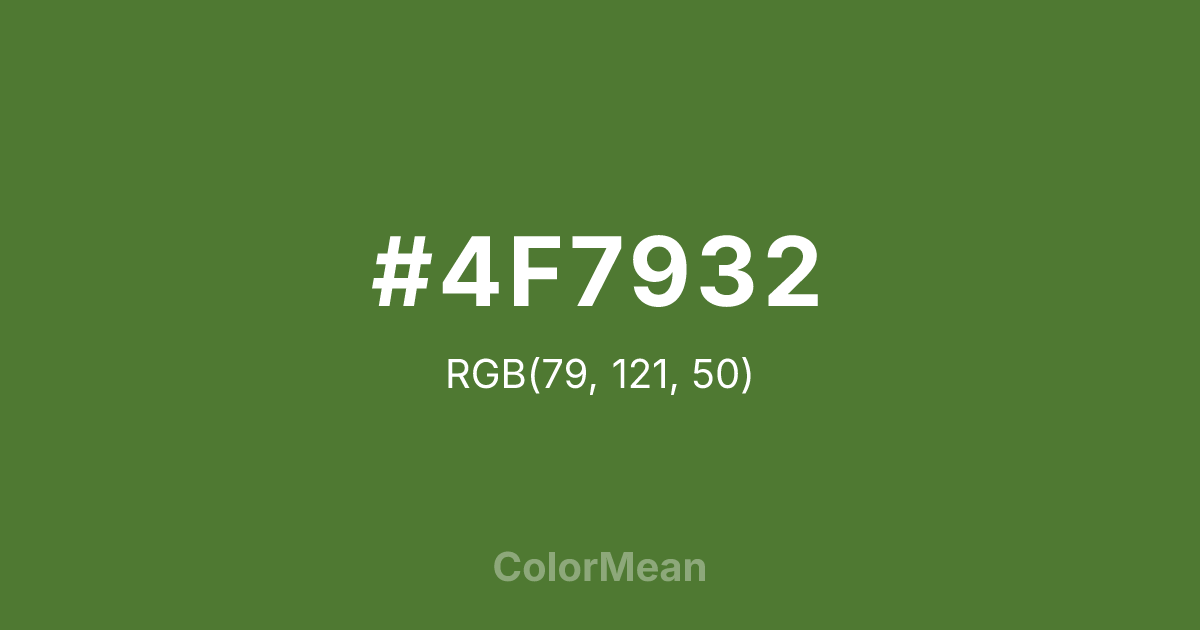 #4F7932 RGB value is (79, 121, 50). The hex color red value is 79, green is 121, and blue is 50. Its HSL format shows a hue of 95°, saturation of 42 percent, and lightness of 34 percent. The CMYK process values are 35 percent, 0 percent, 59 percent, 53 percent.